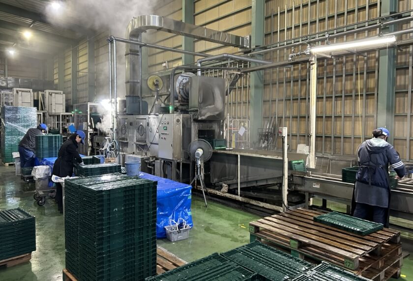 大手量販店で利用されている野菜等を運ぶ樹脂製コンテナを洗浄しています。